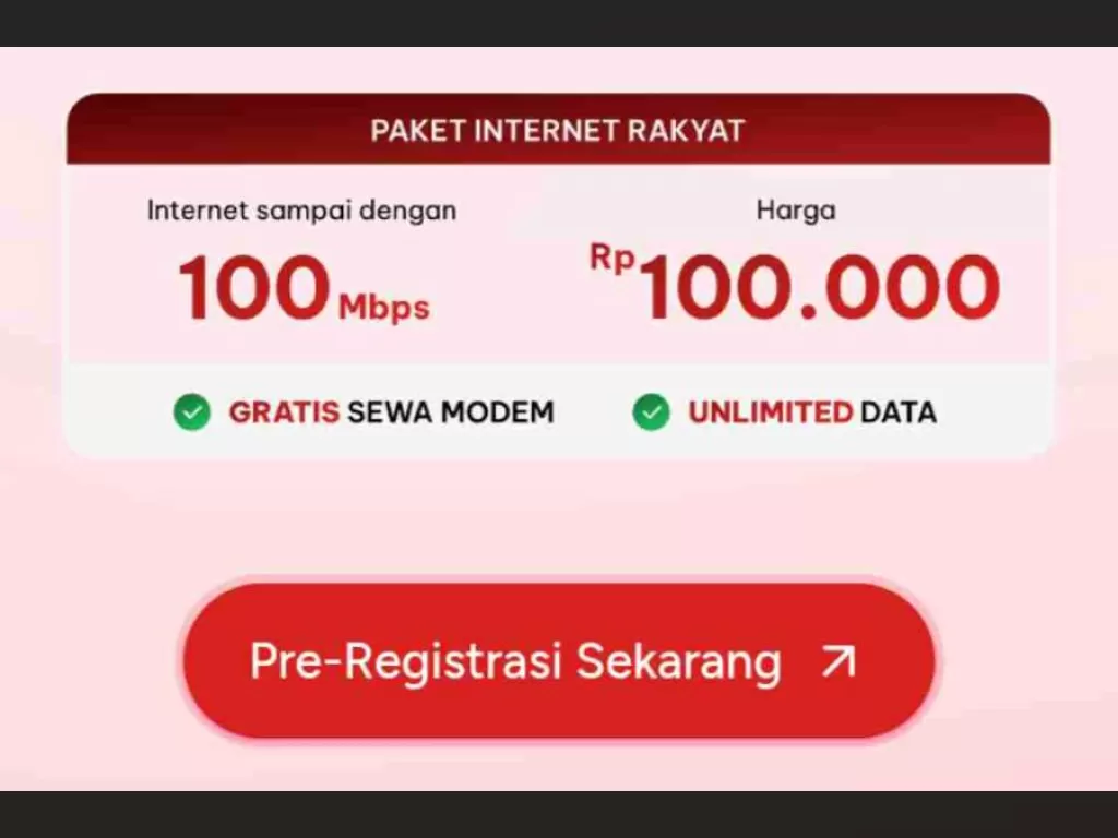 Internet Rakyat menawarkan paket berkecepatan hingga 100 Mbps dengan harga sangat kompetitif, hanya Rp100.000 per bulan. Paket ini dirancang untuk memenuhi kebutuhan rumah tangga dan UMKM dengan proses pendaftaran yang sepenuhnya dilakukan secara online, memudahkan akses masyarakat.